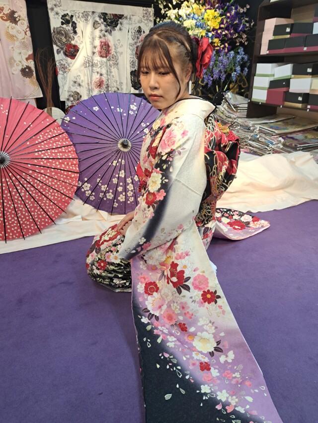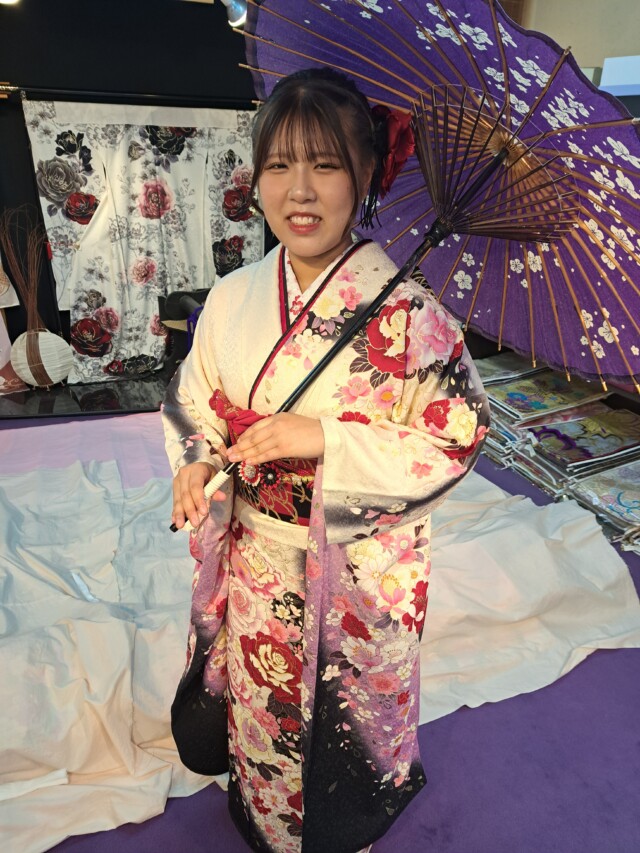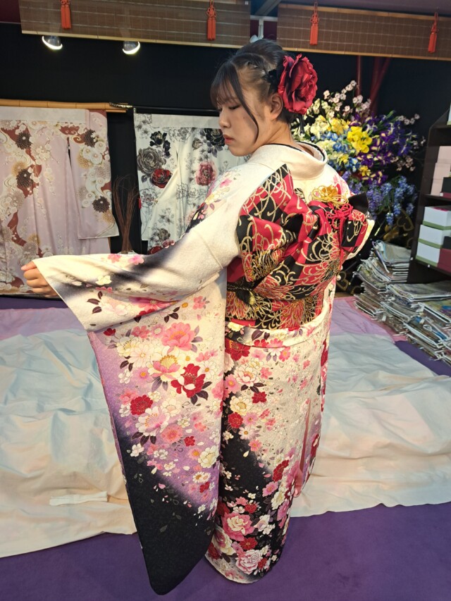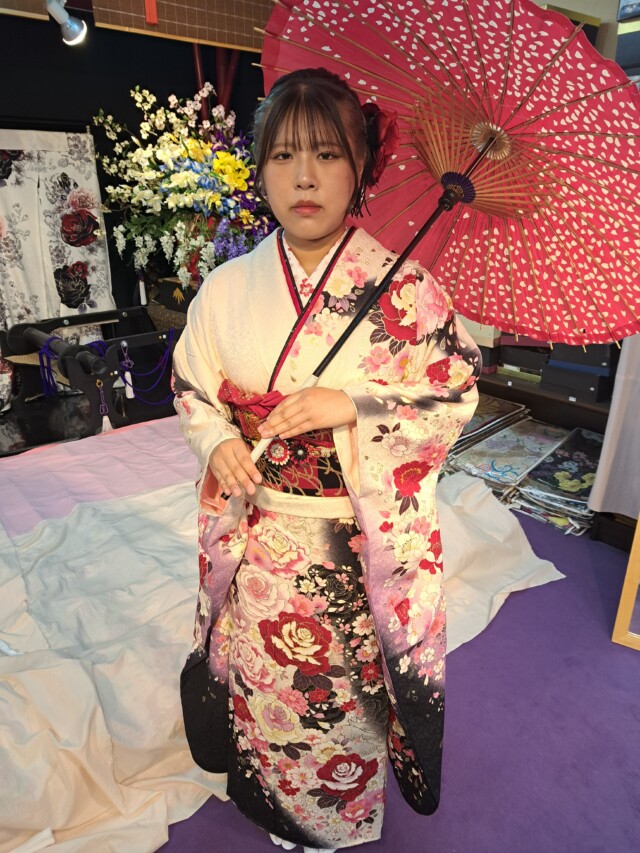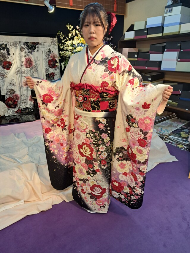 20251009 清楚と豪華を併せ持つ✨️ みんなのコーデ 洋と和の融合コーデ✨️ 本日ご紹介のお嬢様は、鰺ヶ沢町在住のE様県内の学生さんです。白地に赤等の🌹を施した洋風なデザインに鬼滅(・・?ぽい赤×黒地にゴールドで千菊を誂えた帯をマッチング❗決まってます😆