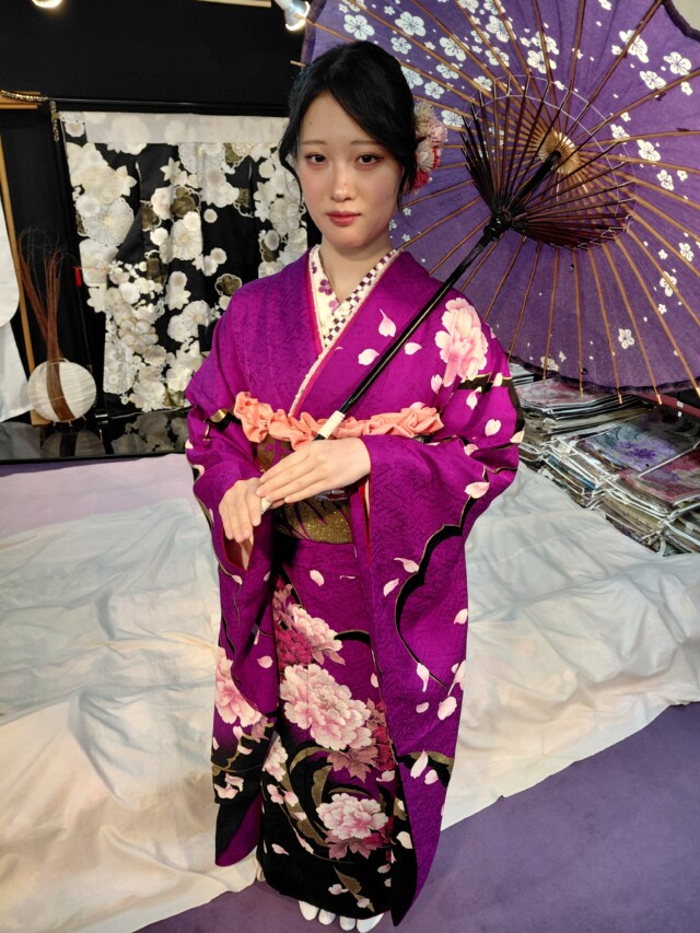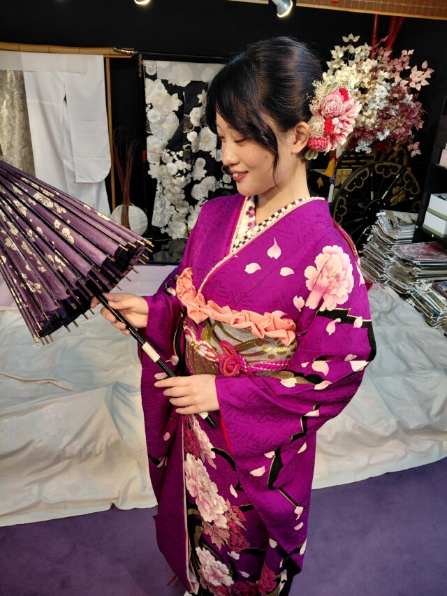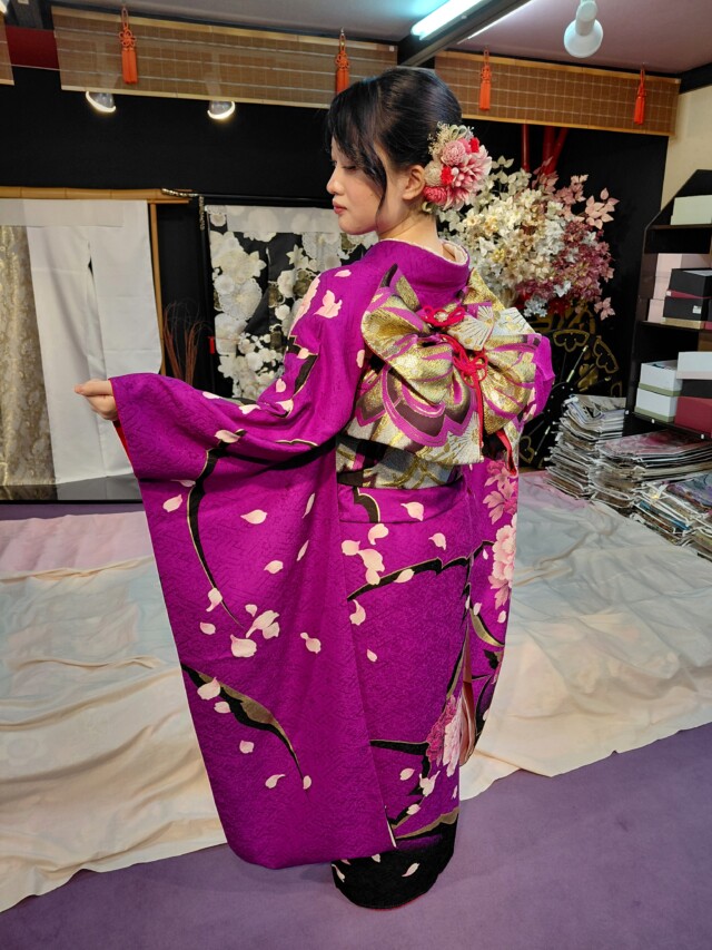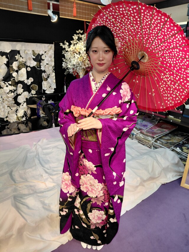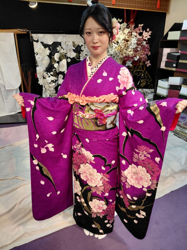 20251221 極める✨️ みんなのコーデ SPECIALなお洒落を極める 本日ご紹介のお嬢様は五所川原市在住のK様、県内の学生さんです。一際目立つ鮮やかな💜紫の地色に大輪の花柄をあしらったインパクト120%越えの振り袖です❗何より花×華に勝る程の笑顔を「ありがとう😆」ございます✨️